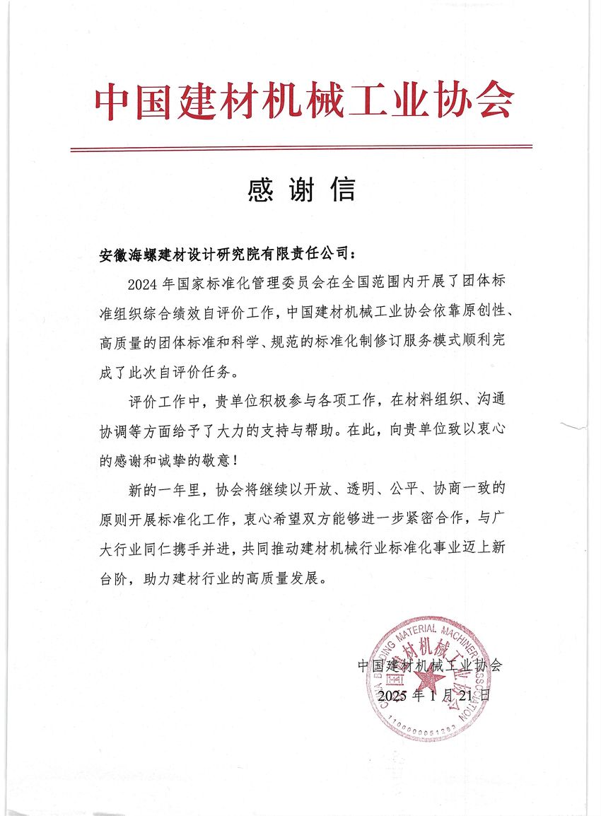 中國建材機械工業(yè)協(xié)會致海螺設(shè)計院感謝信